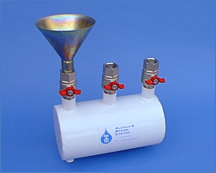 There are three standard models - 5 litre capacity (Model 5K illustrated left), 10 litre and 15 litre capacities. Our standard isolating valves are high temperature, high pressure, chrome plated, quarter turn ball type valves and the standard filling tundish is 6 inch opening, nickel plated for long service.